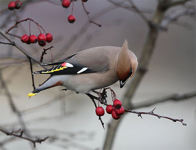 This morning while driving along the Gort Road in Ennis I came upon seven Waxwings. They were gorging themselves on the last few remaining hawthorn berries in two bushes on the side of the main road.